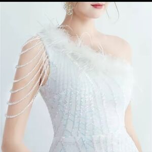 Opalescent, Assymmetrical Neck, Ostrich Feathers, Beaded, Geo ,Sequined Gown