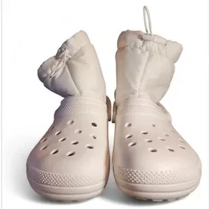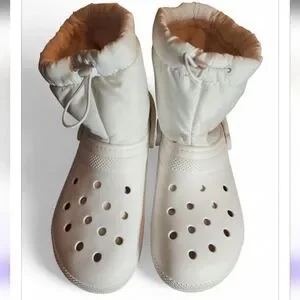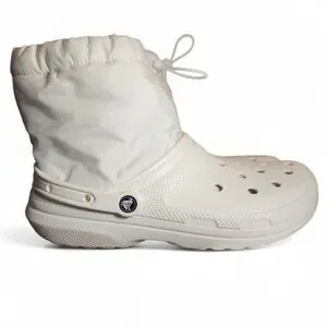 Crocs winter boots, Crocs snow boots, Crocs puff boots, Crocs lined boots, men’s 12 Crocs boots, unisex Crocs rain boots, white Crocs mid-calf boots, warm fleece lined Crocs, Croslite traction sole, casual outdoor waterproof boots