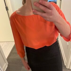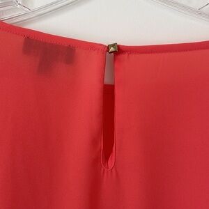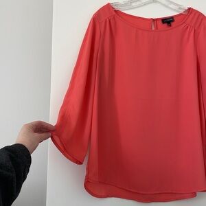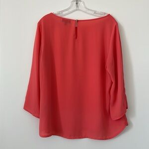 Simple but classic coral/salmon/pinkish top perfect for any occasion. Features a relaxed fit and 3/4 length sleeves. Slightly sheer but not enough for me to wear something underneath it - especially with lighter colored pants. Thin and lays nicely so it’s easy to tuck in. Keyhole opening in the back with a gold stud button. Boatneck.