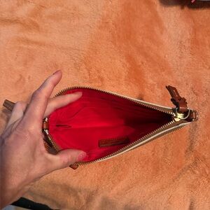 Elegant white wristlet with brown accents. Features a gold zipper and iconic logo. Ideal for stylish outings. Dooney & Bourke, NWOT