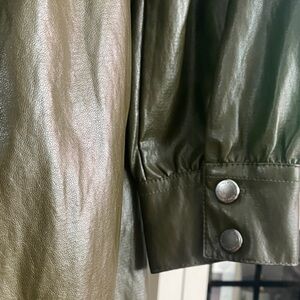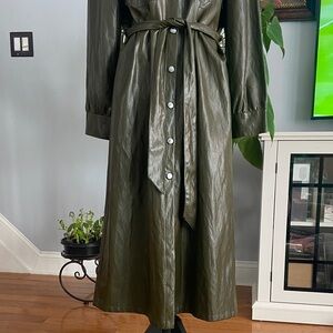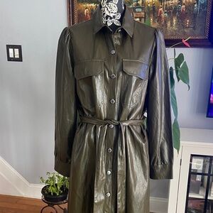 Stylish olive green dress, gorgeous color. Features button-down front. Includes matching belt. Long sleeves with cuffs. Perfect for versatile wear. Will fit M as well. Like new condition, worn twice. Can be worn as a lightweight coat
