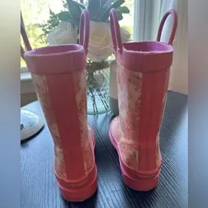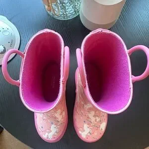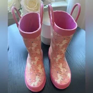 These adorable pink rain boots feature a fun unicorn design, perfect for keeping little feet dry and stylish. Ideal for rainy days and puddle jumping.