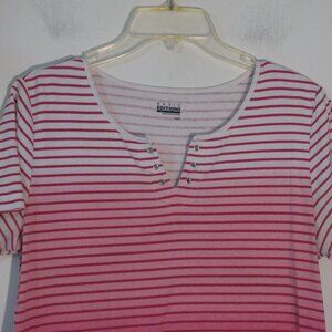 Basic Editions blouse in size medium. Pink and white stripes in a burnout gradient print. Short sleeves and split v neckline. Stretch fabric, made from 60% cotton and 40% poly, machine wash.