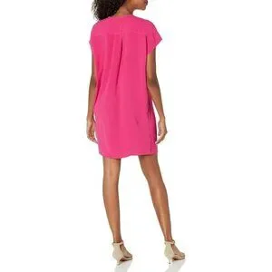 This Trina Turk Women's Size Large Pink Zipper Front Short-Sleeved Dress Cover Up is a stylish and versatile piece perfect for casual occasions. Made from polyester crepe fabric, this short dress features a V-neckline, short sleeves, and a zipper closure for easy wear. The fringe accents and contrasting trim add a touch of designer flair, making it a great choice for the summer season. The solid pink color and shift style make it a vibrant and trendy addition to any wardrobe.