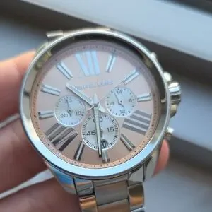 Stylish watch with a pink watch. Silver band and multiple dials. Modern and chic. Needs new batteries. Has light scratches but are not noticeable. please see pictures. without box.