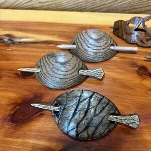 Vintage lot of seven carved wooden stick bun holders/ cages, chignon barrettes, midcentury modern style 1970's, long hair tools.