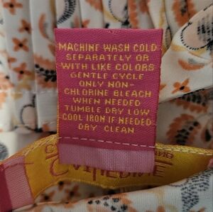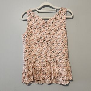 Floral tank top by Catherine Malandrino. Features a cream base with brown floral patterns. Sleeveless design with a pleated hem. Great on its own or under a blazer or cardigan.