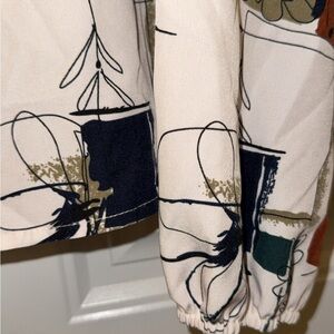 Stylish abstract print blouse. Features a tie-neck design. Perfect for casual or formal wear.