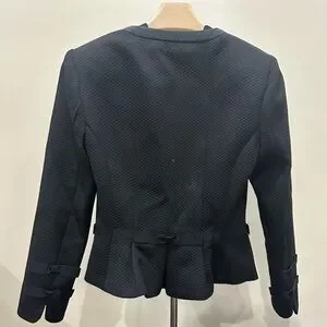 This elegant black peplum suit is perfect for any occasion. Its sleek design offers a flattering fit, making it a must-have in your business or casual wardrobe. Jacket is size 0, dress is size 1.