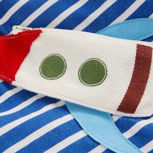 -An applique patch of a flying rocket is sewn onto the T-shirt to from a bag slung over the chest.