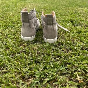 Lightly worn (used once or twice) and in excellent condition. These luxury high-top sneakers feature grey suede/leather paneling with signature spiked toe detail and the classic red bottoms. Retail over $1,195 – grab them here for less!