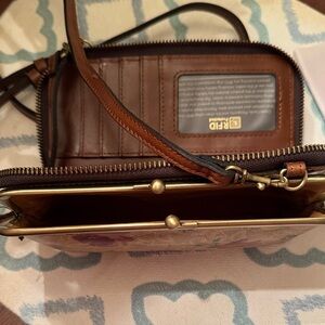 Elegant crossbody bag with floral design. Features a tan background with red flowers. Brown adjustable strap. Perfect for any occasion. Wallet and small purse in one! New, never used.