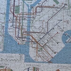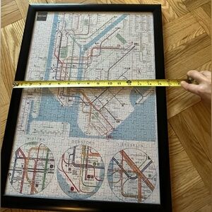 Framed puzzle featuring a detailed NYC subway map. Perfect for decor. Dimensions: 20.5” x 16”