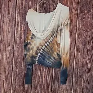 Stylish tie-dye sweatshirt with long sleeves. Features a blend of blue and tan colors. Perfect for casual wear.