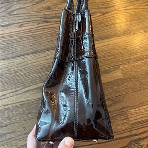 This bag is classy and ladylike but the tote structure makes it unfussy enough for every day use. Bow accent and nameplate on the front. Rolled handles. Brown leather with a reptilian pattern and patent sheen. Lined with signature jacquard. Open top with two compartments divided by a zip pocket, plus smaller slip and zip pockets inside. VGUC, no scuffs or stains but there are some wrinkles in the leather form nomad use.