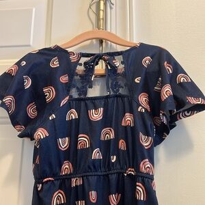 This charming kids dress features a delightful rainbow pattern on a navy blue background. Perfect for any occasion, it combines style and comfort effortlessly. Back has sweet lace panels and a tie