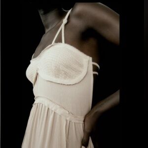 Chic cream maxi dress by Zara. Features a flowing silhouette. Ideal for elegant occasions. Brand new, tags attached.
