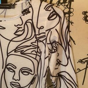 material w/an abstract face print,round neckline & long sleeves. Pair it with a mini skirt