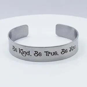 Silver cuff bracelet with 'Be Kind, Be True, Be You' engraving. Elegant and motivational.