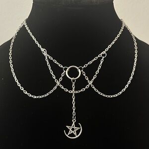Elegant silver chain necklace featuring a crescent moon pendant. Perfect for adding a touch of sophistication to any outfit.