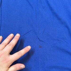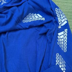 Vibrant royal blue Adidas LS Tee. Features iconic logo on sleeves. Ideal for everyday comfort. Two small stains in front