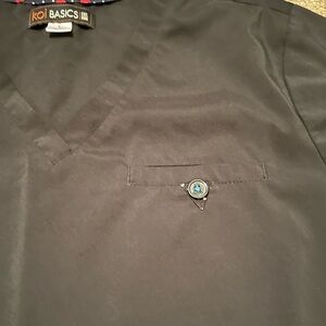 Koi Basics women's black scrub top, v neck with pocket on left breast area, side hems are split. Perfect for tucking in or a great length for wearing out! Comfortable, breathable and stylish.