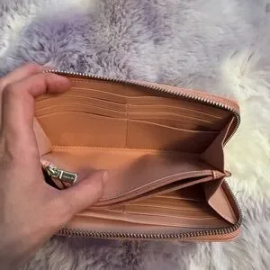 Chic Coach clutch with pink and brown design. Ideal for carrying essentials in style. It has a lot room. Pink inside and the coach pattern on the outside. You got the traditional coach and carriage. Coach silver logo. Middle for change. Smooth leather all the way around and soft leather inside for the card slots. Wallet looks to be from 2003. They really don’t make these good quality wallets with these designs anymore. I find the 2000s better quality leather wise. This is your bigger style wallet. Wallet has the zip around feature. Authentic.