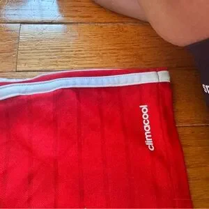 Red Adidas soccer jersey with white accents. Features logo and stripes.