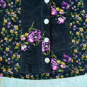 BDG Urban Outfitters mini skirt. Velour/velvet fabric. Black with purple, gold and green floral design. Button up front. Preowned condition with some signs of wear. Some loose threading around buttons but doesn’t affect function.