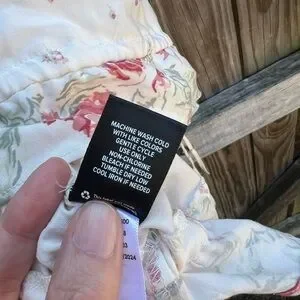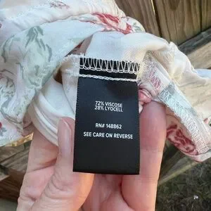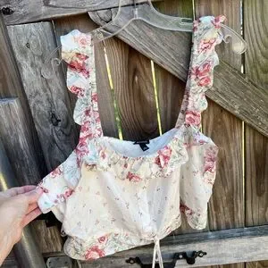 Charming floral blouse with ruffle details. Sleeveless design. Ideal for casual wear.