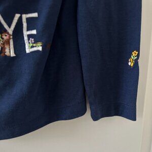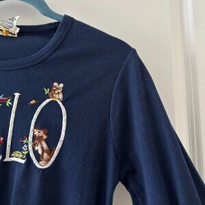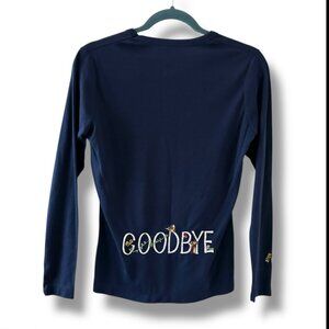 Can't even handle how cute this vintage 80s/90s autumn top is! Navy blue long sleeve tee with "Hello" embroidered on the chest and "Goodbye" embroidered on the lower back, with fall critters and flower illustrations all around them and on the right wrist. The perfect piece for pumpkin season!