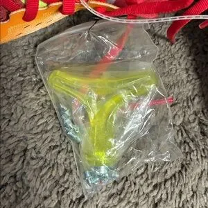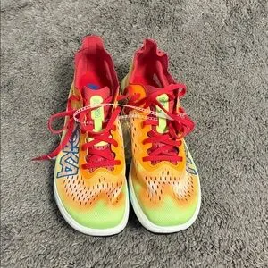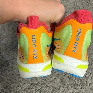 Colorful Hoka spikes. Features bright red and green hues. Perfect for active adventures.
