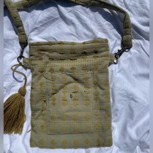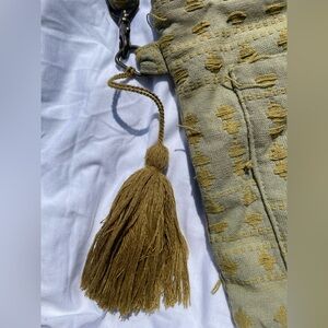 Featuring brass hardware, a cute green tassel, and front pocket for storage.