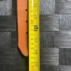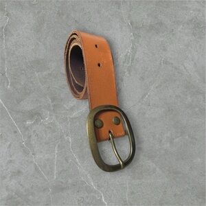 Elevate your style with this tan Genuine Leather belt featuring a classic brass buckle. Friendly used. Great condition. Size Small. 38.5 inches. Maximum sizing holes throughout the belt.