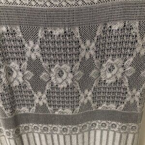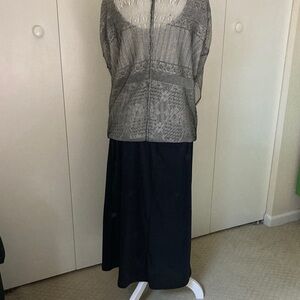 Gorgeous silver openwork maxi dress. Has a full body black slip to prevent transparency while still showing the lovely openwork detail! Scoop neck but not too low. Everyone's favorite vintage brand. Great for semi formal. Provides a background for any color accessories. Previously owned and in excellent condition.