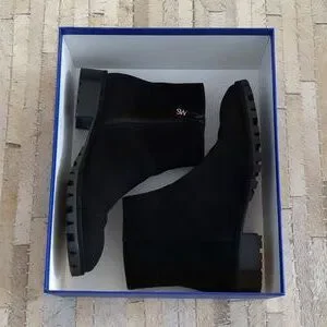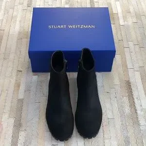 Excellent condition, like new pair of Stuart Weitzman Maelie black sport suede boots, originally purchased for $695. Minimally worn, perfect to dress up or down. Comfy and timeless.