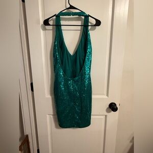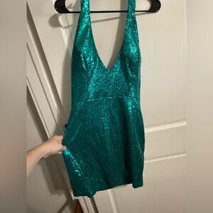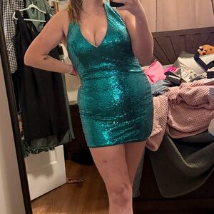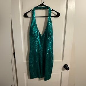 Dazzling teal halter dress with sequins. Perfect for parties and special occasions. Approximately size 10. excellent condition, smoke free home.