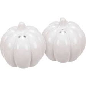 Charming white pumpkin-shaped salt and pepper shakers. Perfect for adding a festive touch to your table.