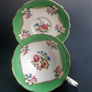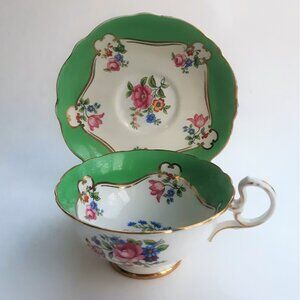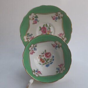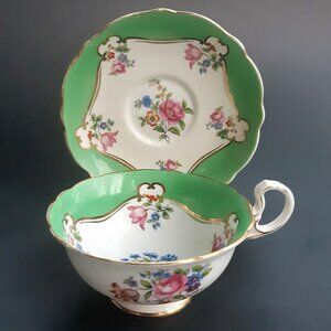 Aynsley Emerald Green Flowers Roses B3052 Pattern Teacup & Saucer England 1930s