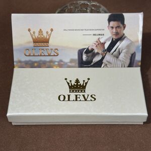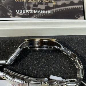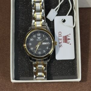 Elegant OLEVS womens wristwatch featuring a classic two-tone stainless steel band (silver with gold accents) and a bold black dial. This quartz movement watch includes a day/date window, luminous hands, and water resistance up to 30M.
