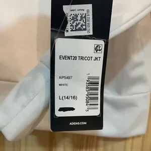 Sleek white bomber jacket by Adidas. Features iconic black stripes on sleeves. Perfect for casual wear.