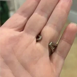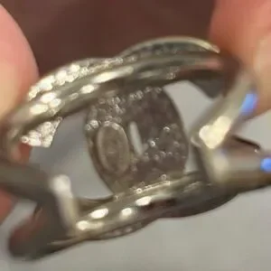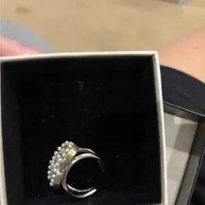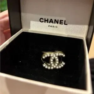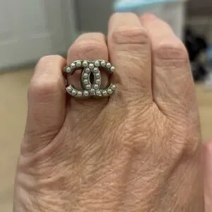 Luxurious CHANEL ring with iconic logo. Silver finish with elegant pearl detailing. A statement piece for any occasion. This comes in a Chanel box but no dust bag. It is adjustable from a size 7 but I would have a jeweler tighten or expand it by one size. I never tried and the metal is firm. I can’t get a clear picture of the tag inside. Make me an offer. I love this ring but I never wear it. Time for someone else to love it.
