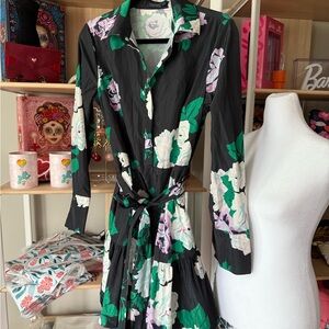 Chic black dress with vibrant green and pink floral accents. Perfect for any occasion. NWT. Size 6. Taffeta material. Comes with belt. Waist s 14 inches . Mini dress. $$$ brand .