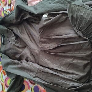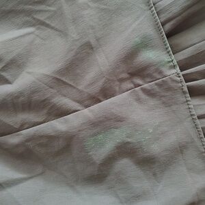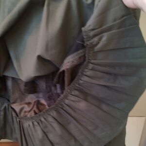 This cotton fully lined olive green dress is quietly sophisticated featuring a stylish floral detail on the shoulder and pleated decorated hem. The dress is designed with a flattering silhouette and a matching belt to accentuate your waistline. Dress it up if you like with a hat, purse, heels, and be ready for tea or outside event. There is a small stain in the lower front and back on the bottom right (see last two pics) but while wearing it you will probably be the only one who knows it's there. Be the one to give this unique dress a second chance. You won't regret it when the compliments start!