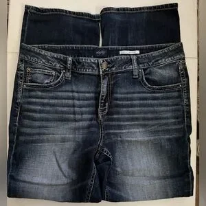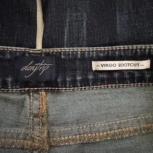 Stylish boot cut jeans by Daytrip. Dark blue with classic stitching. Perfect for versatile wear. Worn less than five times. No flaws. Lost weight and need to downsize my closet!