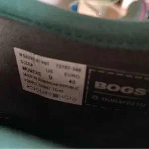 green and floral pattern. No longer have the box but completely brand new, size 9. Great waterproof boot for yard work or splashing in puddles