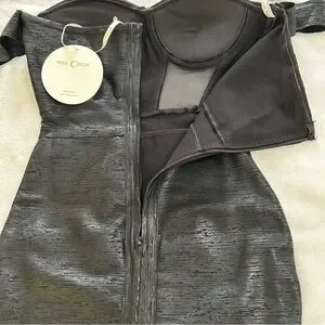 Stunning black off-shoulder dress with a fitted silhouette. Features a unique bustier design and mesh detailing.