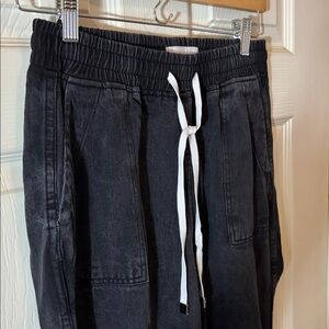 Sleek charcoal joggers with elastic waistband. Features adjustable drawstring. Ideal for everyday comfort. EUC