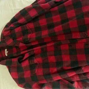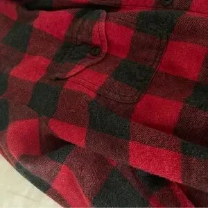 Cozy red and black plaid flannel shirt. Perfect for casual wear.