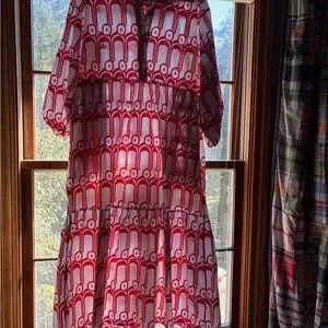 Stylish maxi dress by Maeve for Anthropologie. Features bold red patterns on a white background. Perfect for any occasion. Maeve.